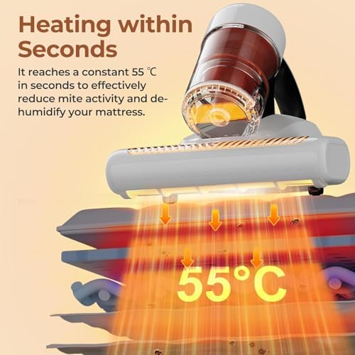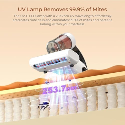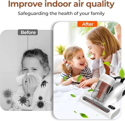 【Tasa de eliminación de ácaros del 99.9%】: La aspiradora de ácaros JIGOO J200 utiliza una longitud de onda de 253.7 nm para liberar luz ultravioleta y expulsa aire caliente a 60°C, eliminando el 99.9% de ácaros del polvo y bacterias ocultos en el colchón. La luz ultravioleta desinfecta los tejidos y perturba el ADN y ARN de los ácaros del polvo, mientras que el aire caliente a 60°C reduce la actividad de los ácaros y deshumidifica su colchón, creando un entorno de sueño higiénico. Para su seguridad, cuando la máquina se levanta, la lámpara ultravioleta se apaga automáticamente para evitar cualquier daño posible a sus ojos.