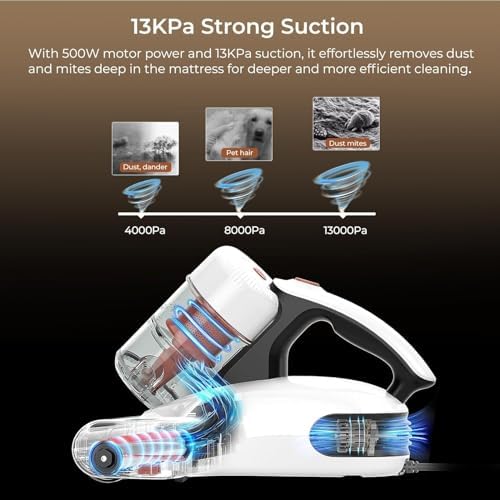 【Potente succión para una limpieza completa】: La aspiradora de colchón JIGOO J200, con su motor de 500W, proporciona una potente succión de hasta 13KPa, logrando una limpieza profunda y sin dejar desorden alguno. Desde la superficie del colchón hasta las capas más profundas, puede eliminar eficazmente todos los ácaros del polvo. Con su amplia boca de succión de 208mm, puede manejar fácilmente camas grandes y sofás largos en cuestión de minutos.