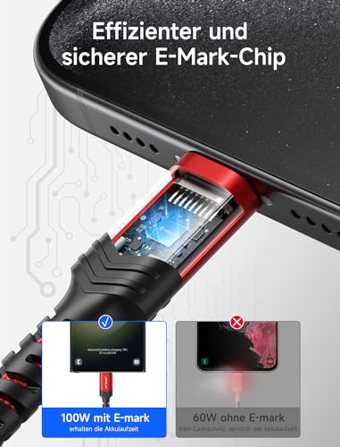 🔋【CARGA RÁPIDA PD DE 100W】 Con el chip E-Mark incorporado mejorado, este chip USB C a USB C admite una potencia de carga máxima de 100W, 3 veces más rápido que el cable USB C de 60 W anterior, compatible con 30 W/45 W/60 W / Cargador USB tipo C de 65W/96W/100W.