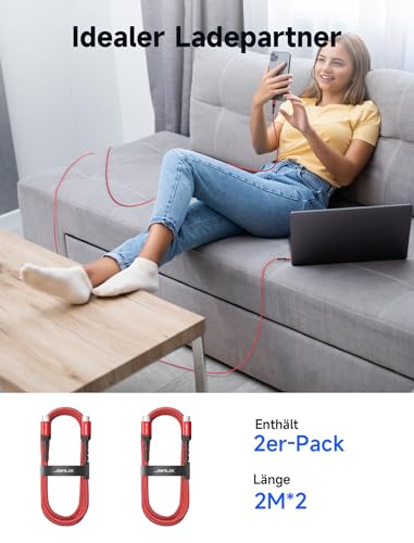 JSAUX 100W Cable USB C a USB C [2 unidades de 2M+2M], 20V/5A QC 4.0/USB PD Cable Tipo C Carga Rápida Compatible con MacBook Pro/Air M2, iPad Pro 12.9/iPad Air/Mini 6, Samsung Galaxy S23 S22 S21 rojo