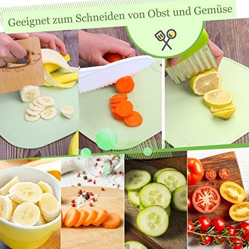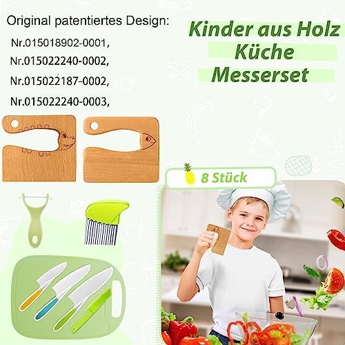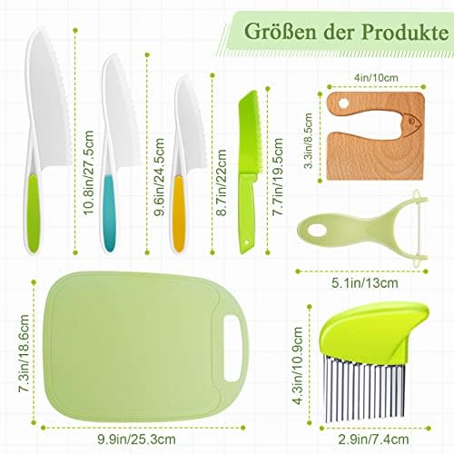 【Kids Kitchen Set】8 herramientas de cocina para niños, incluyendo 4 cuchillos para niños de diferentes tamaños, 1 pelador de patatas de plástico, 1 cuchillo de madera para niños, 1 rebanador de patatas de plástico y 1 tabla de cortar para niños para el juego diario de su hijo o las necesidades de cambio en la cocina.