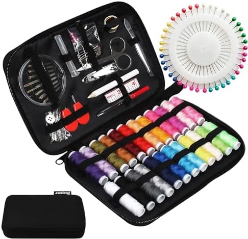 Todo lo que necesitas en la costura – Más de 90 piezas de suministros de costura de primera calidad, incluyendo 24 carretes coloreados, 30 agujas clasificadas de alta calidad, poderosas tijeras de acero inoxidable, cinta y hermosos botones, etc. Ligero y portátil – Estuche rígido resistente que mide 21 cm de largo y 14 cm de ancho cuando está completamente cerrado. También con un bolsillo en el lado y una manija en lazo para el transporte fácil.