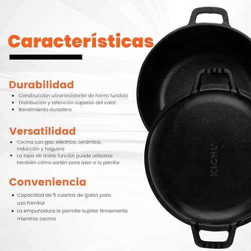 Kichly 2 en 1 Olla De Hierro Fundido Pre-Sazonada Con Tapa Para Asar – Cocinar Al Horno, Freír, Asar, Guisar, Dorar Y Parrilla – Cocina De Interior Y Exterior