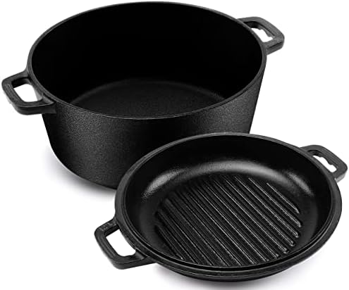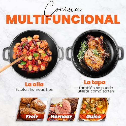 Oferta Combinada: La olla de hierro fundido viene con un paquete 2 en 1. La tapa de la olla se puede utilizar como sartén para asar. La sartén grill estriada es perfecta para asar filetes y barbacoas al aire libre. Se puede utilizar tanto en el horno como en la cocina.
