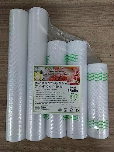 Juego completo de bolsas para envasar al vacio alimentos: Este set de bolsas vacio alimentos KitchenBoss viene con los tamaños perfectos que necesita para sus necesidades específicas. Dentro del set, encontrará 1 rollo de 15x300cm, 2 rollos de 20x300cm, y 2 rollos de 28x300cm, proporcionando un total de 5 bolsas selladas al vacío.