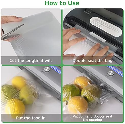 Corte la bolsa a la longitud que desee, y será necesario sellar primero un extremo de la bolsa de vacío para alimentos y colocar la comida dentro, inserte el otro extremo de la abertura en la máquina selladora al vacío y luego la máquina extraerá el aire. . (Asegúrese de eliminar todo el aire antes de crear un sello hermético).
