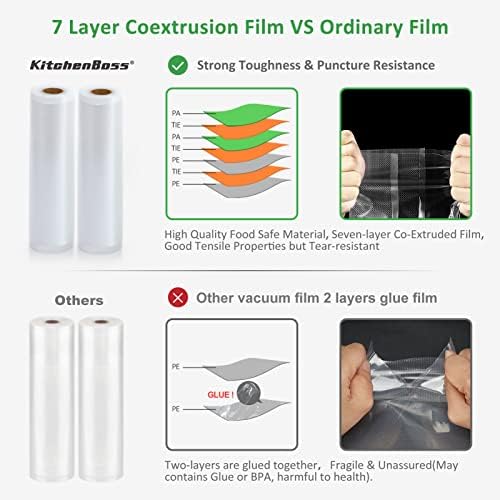 Duraderas y resistentes a los pinchazos: Las bolsas vacio alimentos KitchenBoss cuentan con una película Coastrise antiadherente de 7 capas, muy resistente a los pinchazos. La bolsa de malla en relieve patentada tiene el doble de área de paso de aire que una bolsa de lunares, lo que proporciona un mejor rendimiento de sellado y mantiene sus alimentos frescos hasta 8 veces más tiempo.