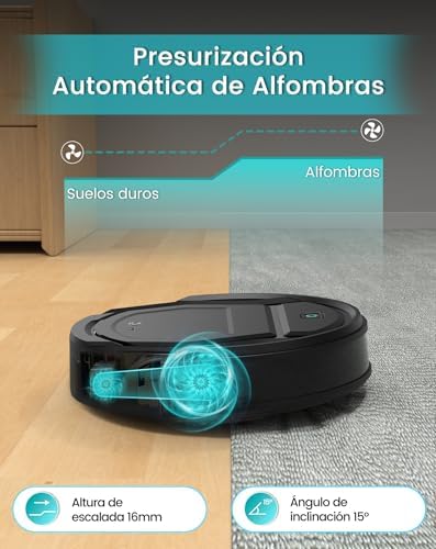 📶【Impulso de alfombra】Optimizado para alfombras. El robot aspirador identifica de manera inteligente las alfombras y aumenta la potencia máxima de succión para obtener un rendimiento de limpieza óptimo. (Esta función se puede activar a través de la aplicación).