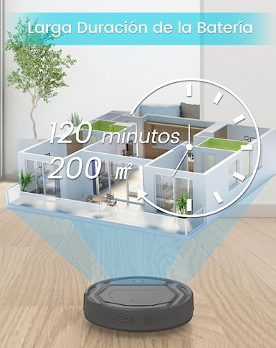 【Diseño compacto】 Con el diseño integral del cuerpo, un diámetro de solo 28 cm y un grosor de 7.85 cm, está diseñado específicamente para espacios estrechos como camas, sofás y esquinas, evitando enredos y con una alta cobertura y tasa de fallas muy baja. La aspirador suelo robot batería tiene una duración de hasta 120 minutos y regresa automáticamente a la estación de carga cuando se completa el ciclo de limpieza o cuando la batería está baja.
