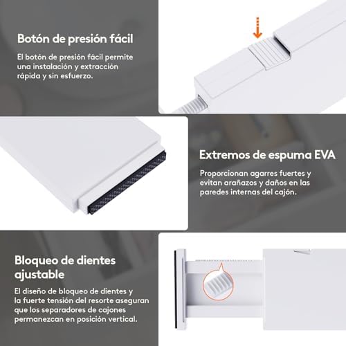 Fácil instalación y extracción: Presiona el botón superior para ajustar la longitud antes de colocarlo y estíralo nuevamente para asegurarlo firmemente antes de bloquearlo. La fuerte tensión del resorte mantiene cada organizador de cajón en posición vertical de forma segura. Para retraerlo, presiona el botón superior y empuja el lado estirado.