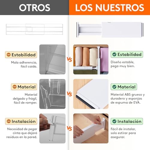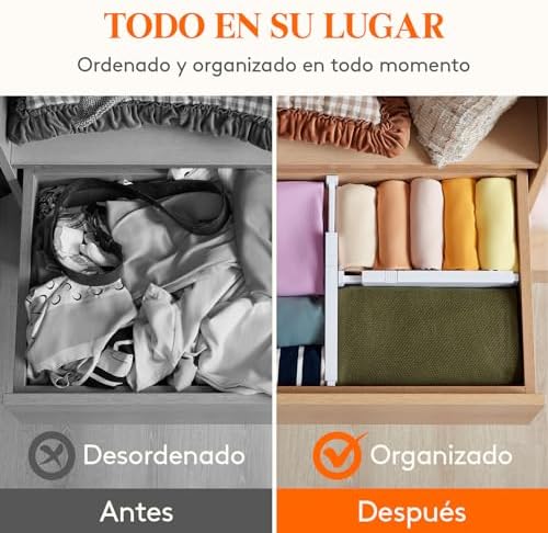 Expandible y ajustable: Con un ancho de 2 cm, una altura de 10 cm y una longitud ajustable que va desde 28 hasta 44.5 cm, nuestros separadores de cajón se adaptan fácilmente a la mayoría de los cajones y gabinetes, proporcionando la solución ideal para mantener tus objetos organizados y tus cajones ordenados en todo momento.