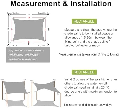 【Fácil de instalar】Tenga en cuenta que se deben permitir 15-30 cm entre cada punto de fijación y la toldo vela.Le recomendamos que instale su toldos vela en un ángulo de 20 a 40 grados (según disponibilidad) para maximizar el drenaje.Se puede fijar a cualquier estructura, edificio o poste. No se recomienda su uso en lluvias intensas y ventiscas