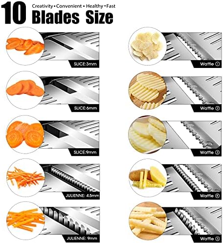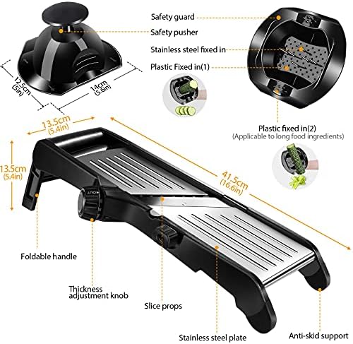 Soporte de Verduras de Mano – Nuestro producto está equipado con un soporte de verduras de mano, que puede fijar la verdura con 6 agujas de acero inoxidable al cortar, lo que hace un corte más uniforme y, lo que es más importante, protege la seguridad de las manos.
