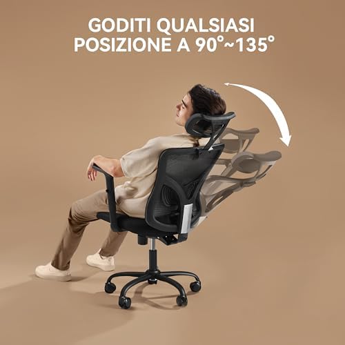 【AJUSTE FLEXIBLE】: La silla de oficina con respaldo alto es altamente personalizable con reposacabezas ajustable en altura, soporte lumbar, reposabrazos 2D y asiento para adaptarse a diferentes alturas y tipos de cuerpo. Lo mejor de todo es que el respaldo de la silla de escritorio se puede reclinar de 90° a 135° para lograr la máxima relajación.