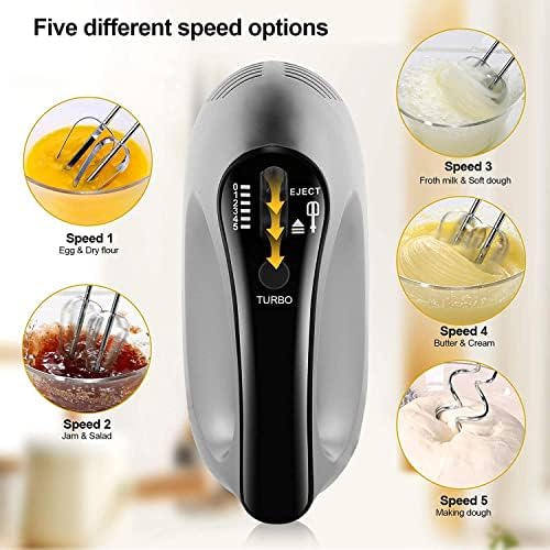 5 NIVELES DE VELOCIDAD: la batidora de varilla eléctrica tiene 5 niveles de velocidad para ajustar, pueden elegir la mejor velocidad para preparar ingredientes y postres. La máquina funciona con una velocidad rápida, lo que la hace más eficiente