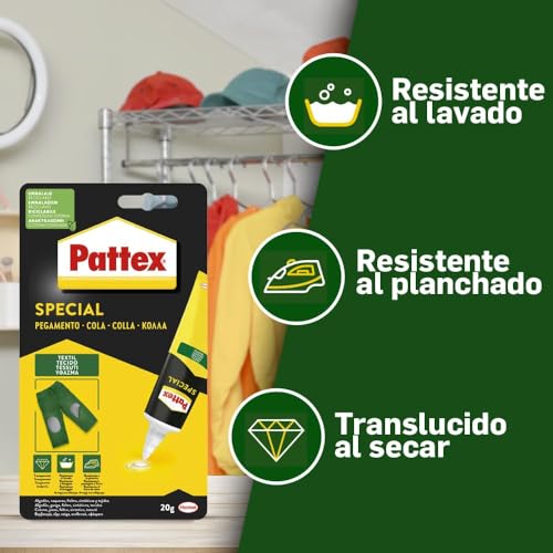 Adhesivo resistente – Pattex Special Textil es un pegamento impermeable transparente resistente a los lavados y el planchado. El planchado adicional aumentará la fuerza de unión.