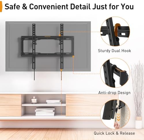 AHORRO DE ESPACIO: El soporte TV pared tiene un de 32mm desde la pared para ahorrar espacio y conseguir un aspecto más limpio y estilizado. Los cierres de seguridad del cable facilitan la fijación del televisor al soporte TV y su extracción.