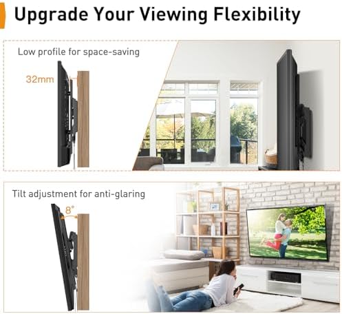 PUNTO DE VISTA ÓPTIMO DE AJUSTE: puede elegir el ángulo de visión más cómodo y saludable. Este soporte TV pared universal puede inclinar 8º hacia abajo para permitir la mejor posición al reducir los reflejos.