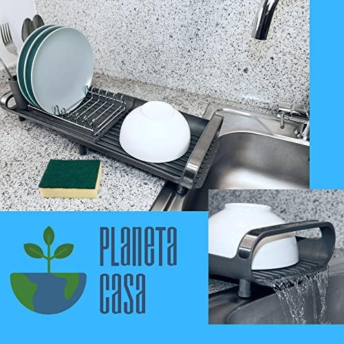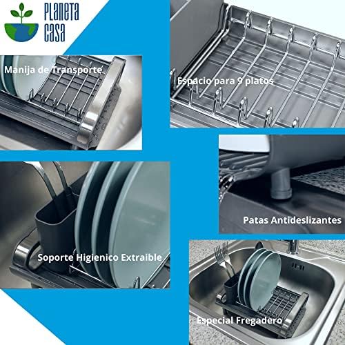 ACERO INOXIDABLE: Apto para secar herramientas de cocina y platos. Se mantiene libre de óxido durante años.DISEÑO INTELIGENTE: Tiene capacidad para secar hasta 9 platos, vasos, cubiertos, y más elementos.DRENAJE HIGIENICO: El escurridor de platos plegable cuenta con una base inclinada que canaliza el agua directamente al fregadero. ¡Cuenta con un SOPORTE DE CUBIERTOS y una Esponja!