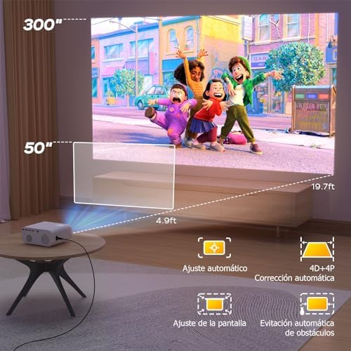 【Proyector 4K Con Autoajuste Sistema】Jimveo J61 es el primer proyector 4K equipado con un sistema inteligente de autoadaptación, que utiliza un algoritmo de red neuronal de inteligencia artificial para realizar correcciones y enfoques de imagen en tiempo real mediante el seguimiento automático de la posición del proyector. Reconoce con precisión el rango de la pantalla y se alinea automáticamente, evitando obstáculos como interruptores de pared y floreros sin perder la claridad de la imagen. Disfruta de una experiencia de visualización sin precedentes con la máxima facilidad.