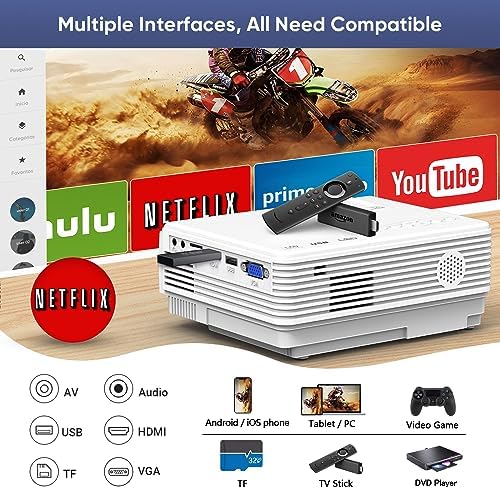 【Múltiples puertos y conexiones】Con puertos HDMI, USB, TF, AV, VGA, cable jack para auriculares y cable HDMI, cable AV incluido en el paquete, el proyector se puede conectar a casi todos los dispositivos de la vida diaria, por ejemplo: computadora portátil, TV box/stick, PS4 , XBox, teléfono móvil, tablet, memorias USB, disco duro externo, reproductor de DVD, ordenador de sobremesa, altavoces, etc.