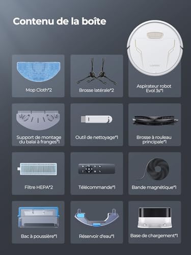 🌪️【4000Pa Succión huracanada】Con su potencia de succión huracanada, el robot aspirador Evol 3s absorbe todo tipo de basura y polvo del suelo en el recogedor incorporado, manteniendo su hogar limpio y ordenado en todo momento. El robot aspirador está equipado con un motor japonés de nueva generación para una alta eficiencia de limpieza.