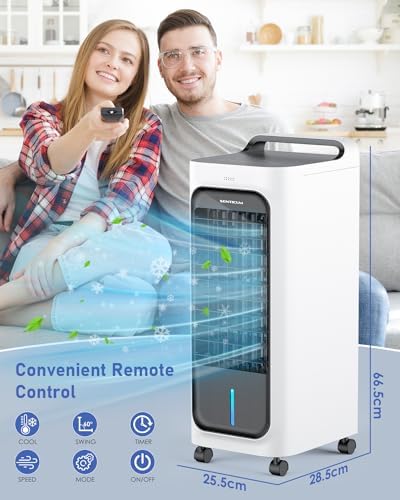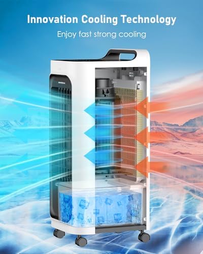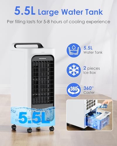 Tanque de agua portátil y grande: con su diseño ligero y ruedas de 360°, este aire acondicionado se puede maniobrar fácilmente y transportar en tu hogar. El tanque de agua de 5,5 L permite el funcionamiento continuo de las habitaciones en modo de refrigeración durante más de 10 horas. 2 cajas de cristal de hielo almacenan abundante energía de refrigeración cuando están congeladas y maximizan el efecto de enfriamiento cuando se colocan en el tanque de agua. Mantenimiento sin esfuerzo y proporcionan aire fresco en todo momento.