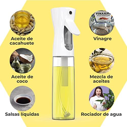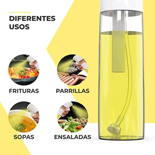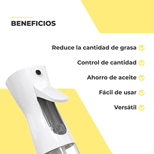 NIEBLA FINA: El dispensador de aceite en Spray dispara en forma de niebla fina consiguiendo repartir el aceite de forma uniforme en la sartén, ensalada, horneados, tostada y otros.
