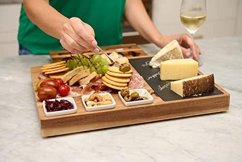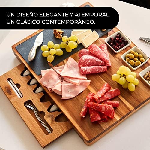 DESATA TU CREATIVIDAD Y AHORRA TIEMPO Con el contemporáneo juego de tabla de quesos de pizarra y accesorios, con cuchillos de acero inoxidable, tenedores y utensilios para servir que puedes meter en el lavavajillas.