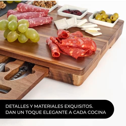 Juego de accesorios que incluye cuchillos, tenedores y útiles para servir de acero inoxidable Juego integrado con tabla de quesos de teja Nuestra tabla de servir está fabricada con madera de acacia de fuentes sostenibles Nuestra tabla de servir quesos tiene el tamaño perfecto: 35 x 46 x 4.5 cm