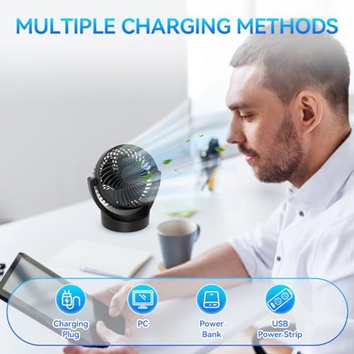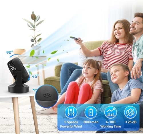 Bajo Nivel De Ruido: Nuestro ventilador de escritorio funciona a un volumen inferior a 25 decibelios, para que su trabajo y descanso no se vean perturbados por ruidos fuertes, y pueda disfrutar del frescor sin hacer ruido.Batería de 3000mAh: Equipado con una batería de alta capacidad de 3000mAh, que le proporciona un tiempo de uso de larga duración. No hay necesidad de carga frecuente.4-10 Horas De Tiempo De Trabajo: Con la gestión eficiente de la batería y el diseño de ahorro de energía, nuestro ventilador de escritorio puede lograr de 4 a 10 horas de tiempo de trabajo sin parar después de una sola carga, para satisfacer sus necesidades de diferentes períodos de tiempo.Recargable Por Usb: El diseño recargable USB conveniente y portátil le permite cargar el ventilador a través de ordenadores portátiles, bancos de energía y otros dispositivos en cualquier momento y en cualquier lugar, eliminando la dependencia de las tomas de corriente.5 Niveles De Velocidad Del Viento: 5 niveles de ajuste de la velocidad del viento para satisfacer sus diferentes necesidades. Ya sea que necesite una brisa suave o un fuerte enfriamiento, puede elegir de acuerdo a la situación real.Tamaño Compacto: Este es un mini ventilador, mide 16.5 *17 cm (6.5″ *6.69″), 320g, ligero y ahorra espacio. El diseño compacto permite colocar fácilmente el ventilador de sobremesa en cualquier espacio, ya sea una mesa de oficina, una mesilla de noche o un escritorio.