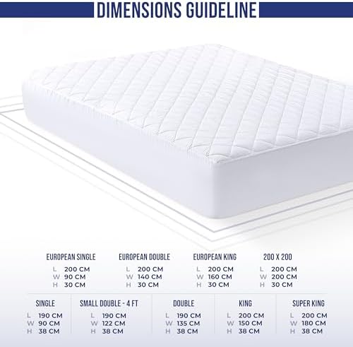 El protector de colchón acolchado mide 122 x 190 cm; El faldón se estira para adaptarse a un colchón de hasta 38 cm de profundidad; (NO ES IMPERMEABLE)