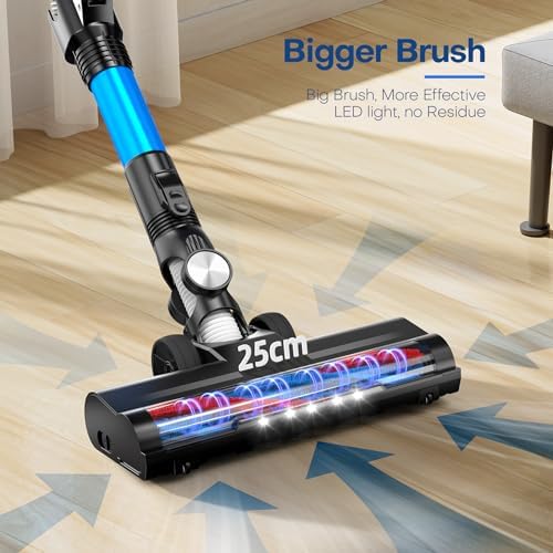 【Rotación de 270° e Iluminación LED】¡Enfrenta cada rincón sin esfuerzo! Aspirador sin cable potente presume de una cabeza giratoria de 270°, moviéndose 180° a la izquierda y a la derecha, y 90° arriba y abajo, maniobrando sin esfuerzo alrededor de obstáculos y espacios estrechos. Su luz LED integrada asegura que la suciedad no quede oculta en áreas oscuras.