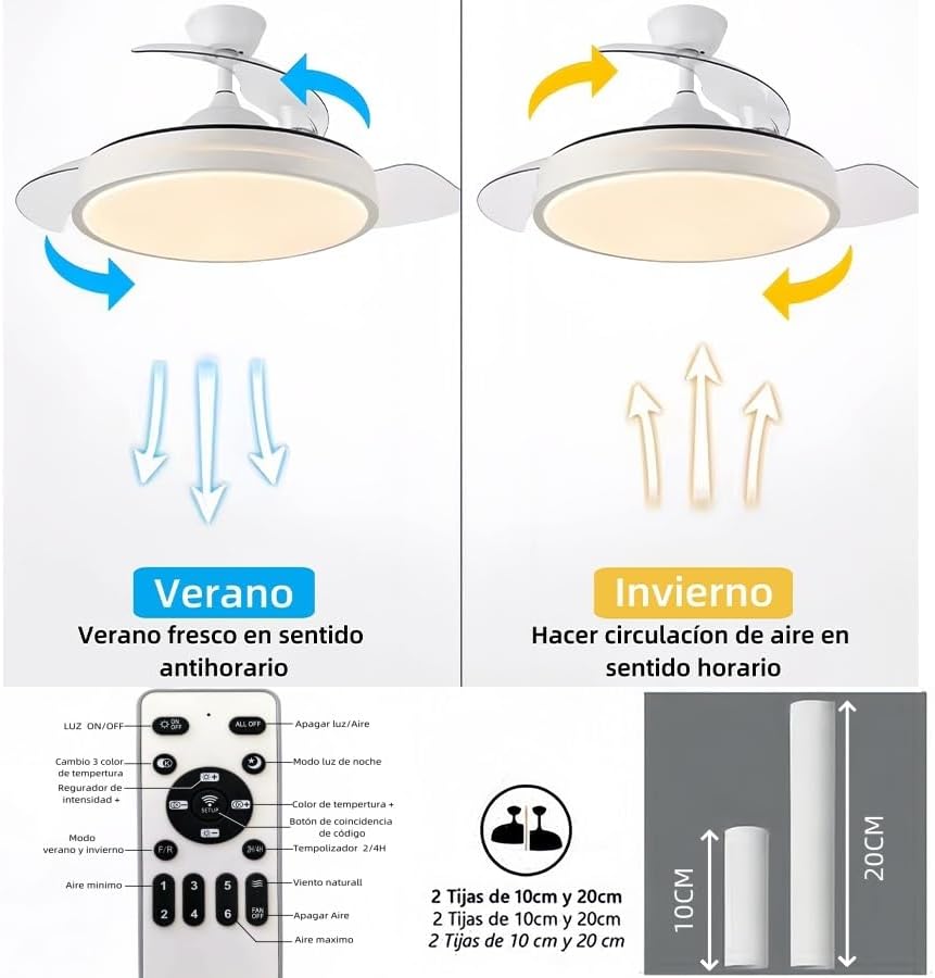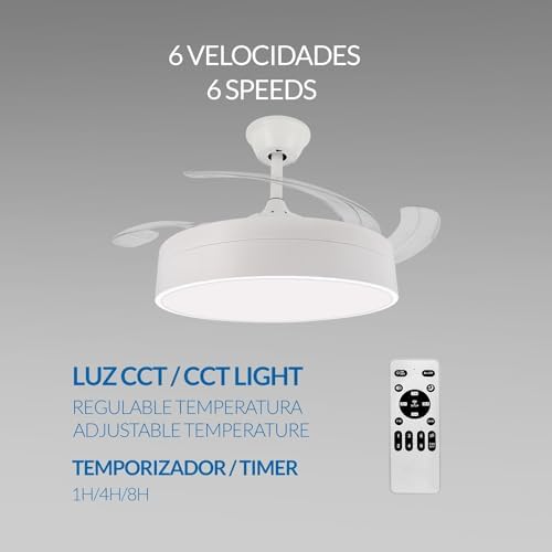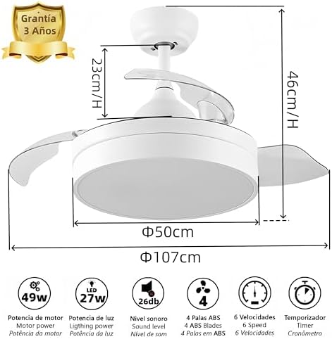 Potencia de luz: 72WCómo controlar: control remotoMotor: DCVida útil: 30000HDimensión: 1007(Aspas Desplegadas)X400H mmTemperatura de color: CCT
